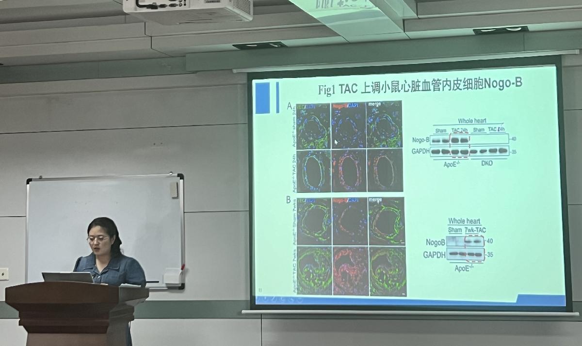 惠毅博士做了题为“全国中医经典理论与临证指要师资研修班学习成果交流分享”的报告。主要分享了全国中医经典理论与临证指要师资研修班学习成果,内容紧跟新冠疫情防治前沿,理论与实践相结合,既有温病经典理论的探讨,又有名医临床经验的分享,还有名师教学经验的总结,课程思政的课堂创新。具体分四个部分介绍,分别为守正经典核心地位,理论与临床协同发展,教学方法与时俱进,课程思政融合创新。马晓真博士做了题为“Nogo-B介导压力超负荷小鼠心脏内皮氧化应激和炎症促进冠状动脉粥样硬化”的文献汇报。首先提出内皮细胞功能障碍在动脉粥样硬化中起重要作用,但其详细机制尚未完全阐明。接着证实内质网结构蛋白质Nogo-B能通过稳定Mfn2介导内质网-线粒体互作,增加线粒体对Ca2+摄取和ROS水平,激活p38-p65信号轴增强炎症反应以调控内皮细胞中细胞黏附分子VCAM-1、ICAM-1的转录,促进内皮细胞炎症及功能障碍,从而促进压力超负荷小鼠冠状动脉粥样硬化的发生发展。最后提出,该结果将为Nogo B在高血压和高胆固醇血症条件下改善内皮功能障碍和冠状动脉粥样硬化提供新的理论依据。