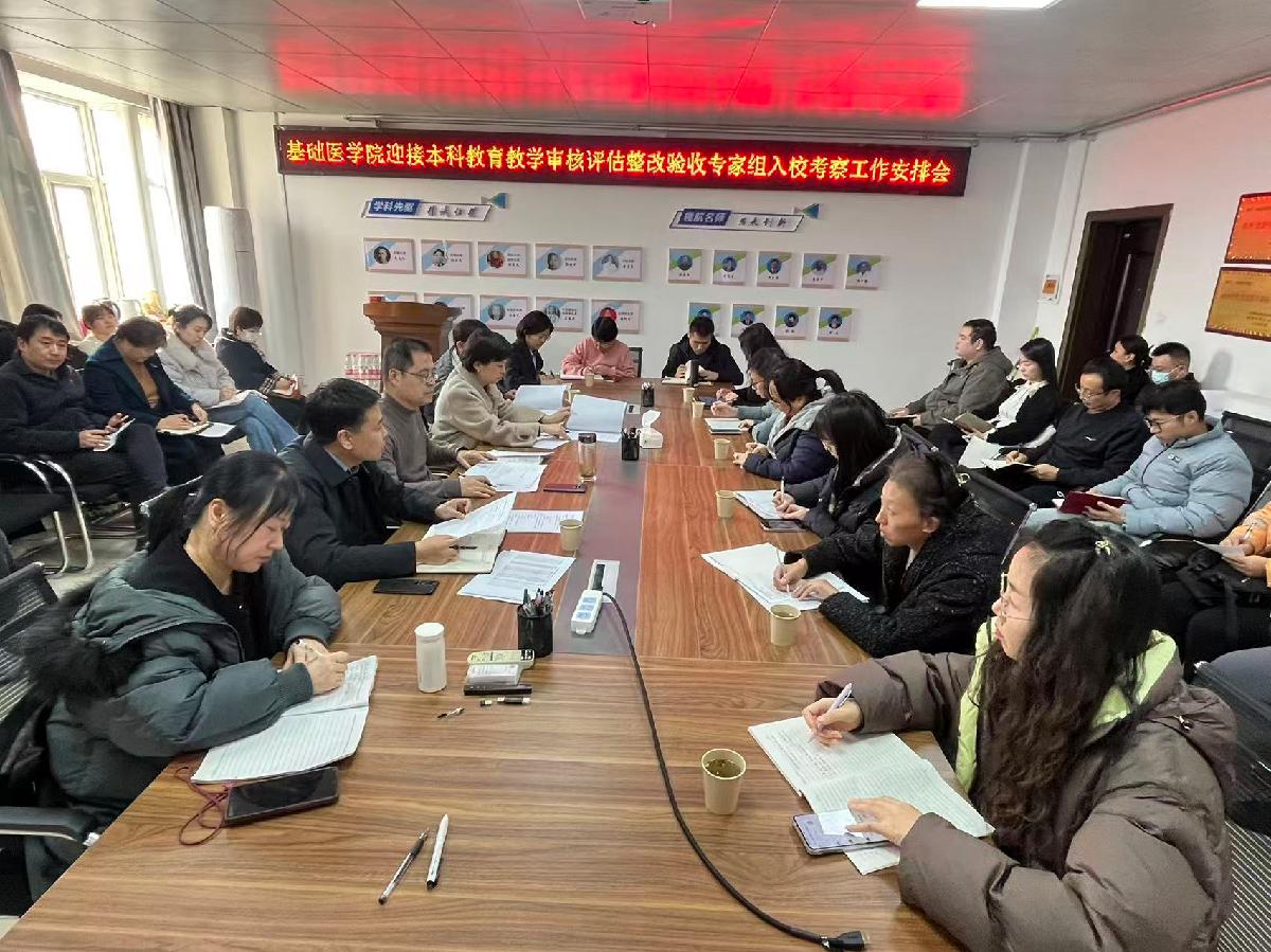 12月18日,基础医学院在综合楼教研活动中心召开迎接本科教育教学审核评估整改验收专家组入校考察工作安排会。学院领导班子、科级干部、教研室主任和秘书,以及学院教育教学督导组参加会议,会议由学院副书记、副院长柏鲁宁主持。