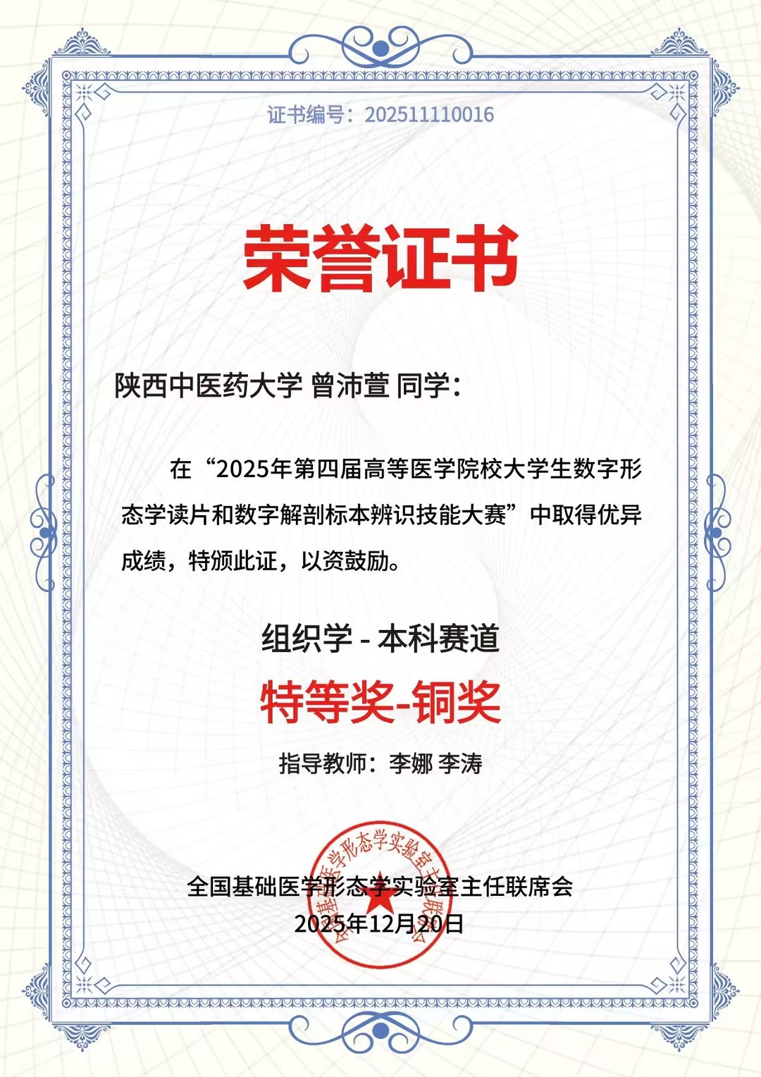 近日,第四届全国高等医学院校医学形态学系列大赛圆满落幕,由我院组胚教任李涛、李娜指导的中医学专业曾沛萱在组织学赛道中取得全国本科组前1%的优异成绩,荣获“第四届全国大学生医学形态学数字切片读片大赛‘组织学—本科赛道一等奖’”,在线下总决赛中,夺得“组织学—本科赛道特等奖铜奖”,李涛、王少兰指导冯洋获组织学二等奖,范妤、刘芳指导任雨晨获组织学二等奖,病理学教研室方艳、潘艳芳、石丹宁指导彭雅馨获病理学二等奖,解剖教研室姬军风、李云肖、王楠指导董婉莹获解剖学三等奖。