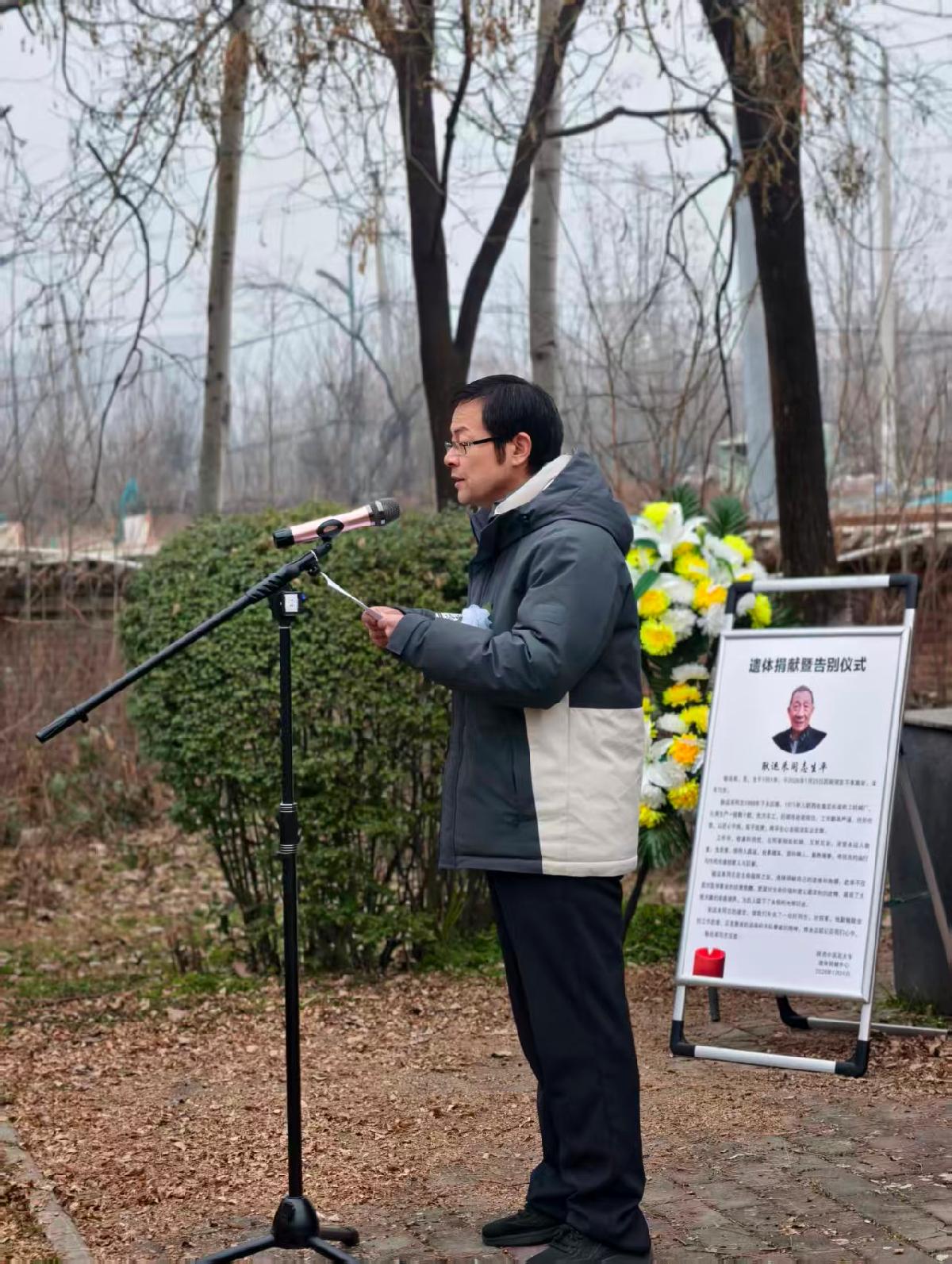 宋逍副院长在致辞中向耿运来同志及其家属致以崇高敬意,并颁发遗体捐献证书。他指出,耿运来同志将自己的遗体无偿捐献给医学教育事业,是将生命升华为更高层次的爱与善,耿运来同志及家人高尚的情操和崇高的思想境界令我们感动,大爱无言,使我们更加领悟了生命的真谛。