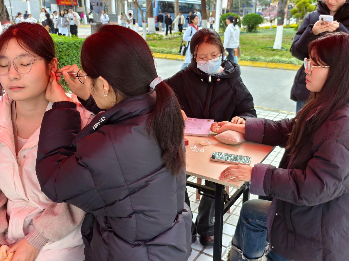“传承雷锋精神,医心守护安康” 主题义诊,推出脉诊、推拿、耳穴压豆等特色中医志愿服务。志愿者们以严谨专业的态度,为师生与群众提供一对一健康服务。脉诊区里,学子们凭脉辨证、细致讲解,结合脉象特点给出个性化调理建议,尽显扎实功底与责任担当;推拿服务点上,手法规范、力道适中,专注开展肩颈放松、腰背舒缓与精准穴位按压,有效缓解疲劳不适;耳穴体验区中,精准取穴、耐心贴压,同步科普失眠、疲劳、颈肩不适等常见问题的耳穴保健知识,把中医养生送到群众身边。