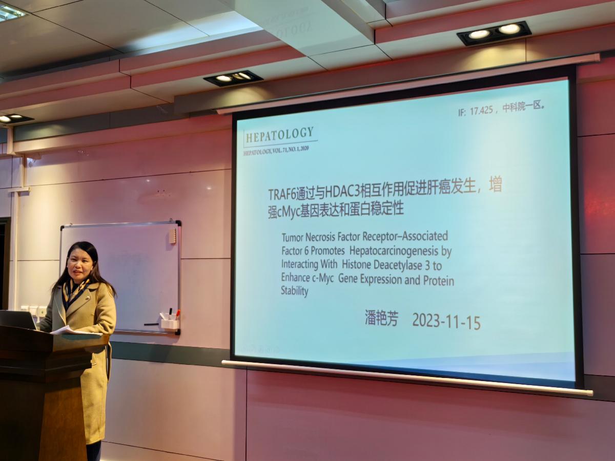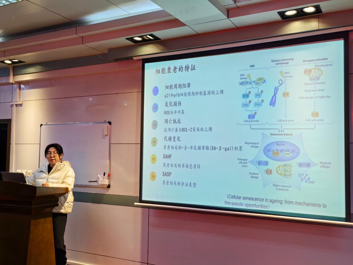 潘艳芳博士做了题为“TRAF6通过与HDAC3相互作用促进肝癌发生增强cMyc基因表达和蛋白稳定性”的文献汇报。该研究从癌组织中TRAF6和c-Myc表达升高这一现象入手,首先证明了TRAF6与HDAC3相互作用并可介导后者的泛素化,导致HDAC3从c-Myc启动子解离及组蛋白H3K9乙酰化水平升高,从而增强了c-Myc的mRNA转录水平。其次,HDAC3泛素化会干扰HDAC3与c-Myc的相互作用,促进c-Myc蛋白的乙酰化,从而抑制C-末端热休克70kDa蛋白的相互作用蛋白介导的c-Myc泛素化和降解,最终增强c-Myc蛋白的稳定性。这些发现证明了TRAF6通过调节TRAF6/HDAC3/c-Myc信号通路影响肝癌的发展和预后,可能对HCC治疗产生重要影响。张玫倩博士做了题为“从机制到干预:内皮细胞衰老的深度解析”的文献报告。内皮细胞是定位于循环血液和半实体组织之间的重要界面,在维持全身生理功能中起着重要作用。内皮细胞衰老已被确定为各种心血管和代谢疾病的重要诱发因素。该文献报道了内皮细胞暴露于损伤性刺激的后果以及诱导内皮细胞衰老的细胞和分子机制。其次,讨论了内皮细胞衰老如何引起血管功能障碍,并在临床上诱发心血管疾病和代谢紊乱。最后,总结了清除衰老内皮细胞疗法有效性的最新证据,并确定了未来研究中亟待解决的重要问题。