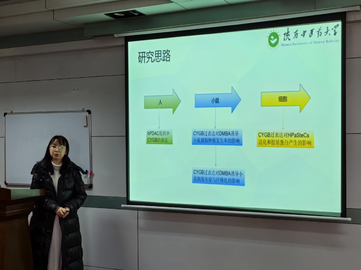 张文将博士结合自身研究经历,对APOE-/-小鼠在疾病中的模型应用进行分享。汇报内容分两部分,一是从国内外动脉硬化疾病模型研究现状、APOE功能、APOE-/-小鼠形成动脉硬化的特点及造模方法等方面进行归纳总结,重点介绍了APOE-/-小鼠在动脉粥样硬化中的应用;二是介绍了APOE-/-小鼠在高脂血证模型、冠心病痰瘀互结证模型、心肌纤维化模型、非酒精性脂肪肝模型、肾纤维化模型等其他疾病模型中的应用。杨冬梨博士分享了题为“Cytoglobin attenuates pancreatic cancer growth via scavenging reactive oxygen species”的文献。首先介绍了细胞珠蛋白(CYGB)的研究背景和论文的研究思路,然后从人胰腺导管腺癌组织、细胞珠蛋白转基因小鼠、胰腺星状细胞和胰腺癌细胞层层深入,探讨了细胞珠蛋白减轻氧化应激抑制胰腺癌细胞的作用。该研究发现CYGB可抑制DMBA诱导的转基因小鼠胰腺癌的发生,减少人胰腺癌细胞增殖、集落形成和细胞迁移,其通过细胞周期阻滞抑制癌症细胞生长的机制与清除ROS作用密切相关。
